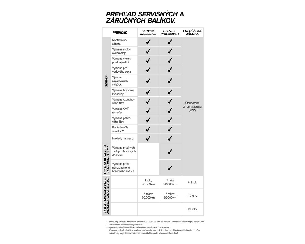 Balík zahŕňa všetky servisné práce BMW Motorrad* počas dohodnutého obdobia platnosti balíka/dohodnutej prejazdenej vzdialenosti v rámci balíka.